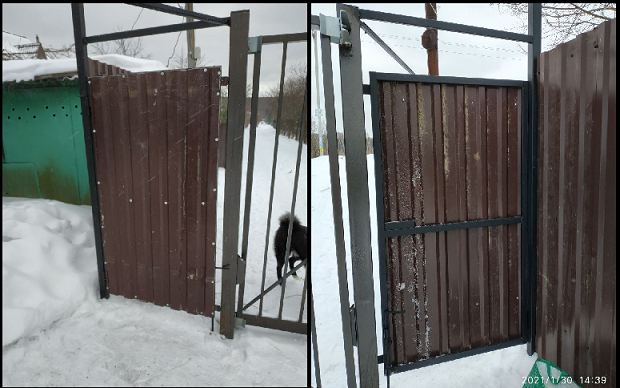Силами неравнодушного мастера и охранной собаки закрыта профлистом калитка.